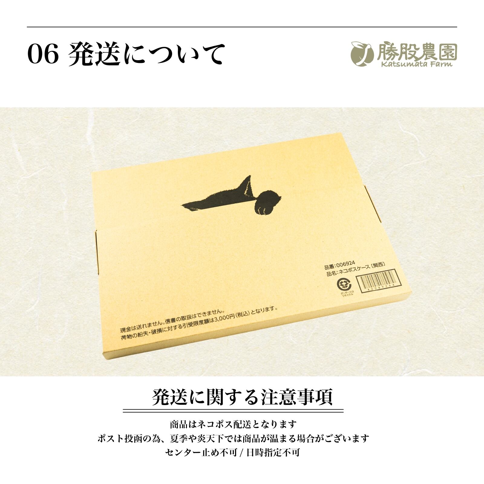 ポスト投函のため、夏季や炎天下では商品が温まる場合がございます。
