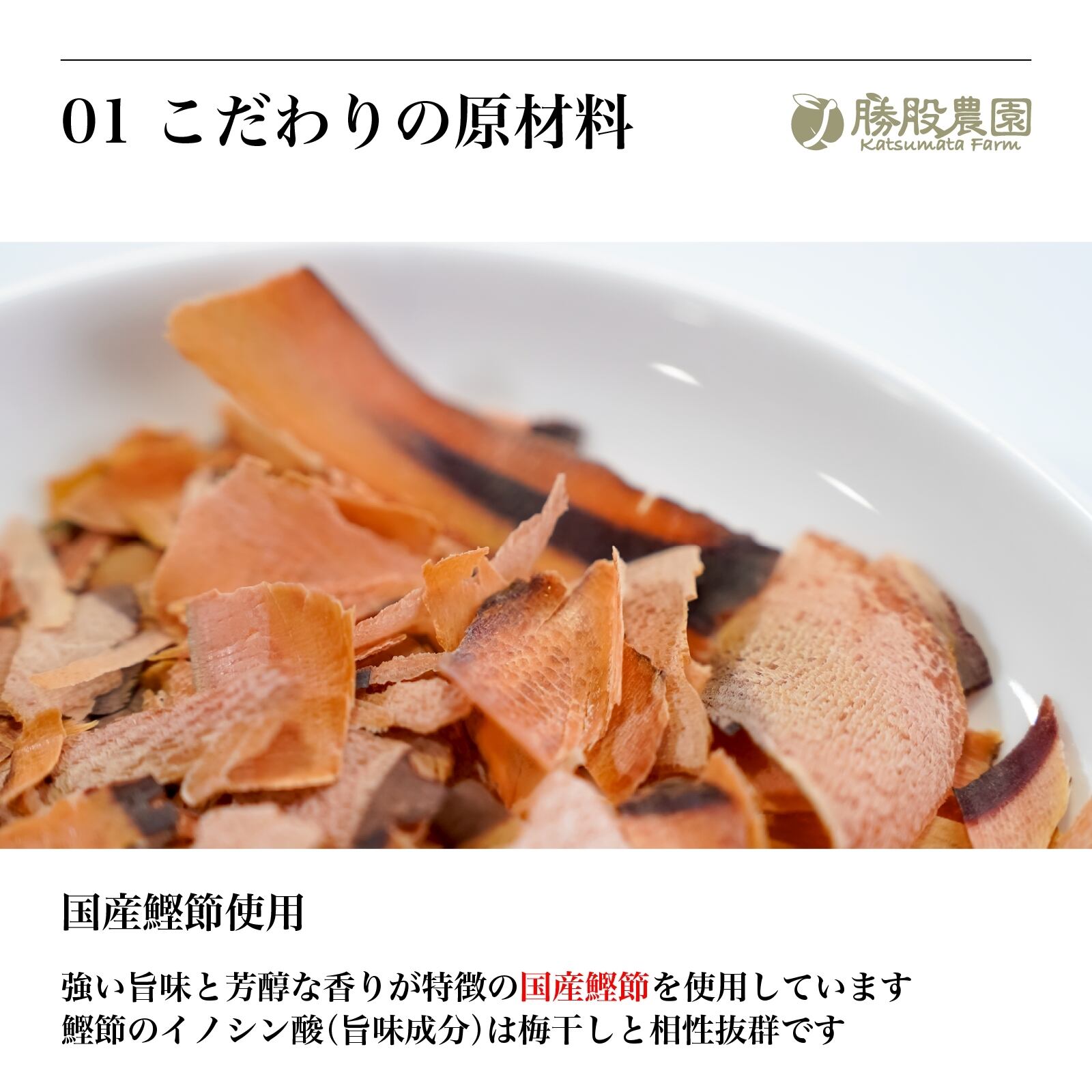 自社栽培の赤しそを細かく刻んだものと、九州産のかつお節を合わせた特製フレークを上からまぶした、風味豊かなかつお梅です。