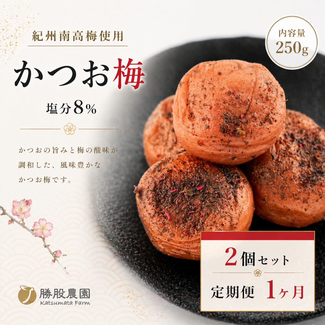 【1ヶ月に1回・定期便】紀州南高 かつお梅 塩分8% 250g×2 全国送料無料
